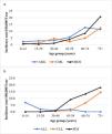 Age-specific incidence rates of primary hematologic malignanciesThe age-specific annual incidence rates per 100,000 of the population by age group for primary myeloid and lymphoid malignancies are illustrated in Figure 1a and b, respectively. The incidence of AML showed a peak at 60 to 74 years (12.8). The CML incidence rate was 4.6 at 30 to 44 years, declining at 45 to 59 years before increasing gradually, reaching 12.4 at 75+ years. The MDS rates increased sharply after the age of 59, reaching a maximum at 75+ years (20.9). The ALL was more common in childhood, with an incidence rate of 6.9 in the age group of 0 to 14 years (0 - 4 years: 3.13, 5 - 9 years: 2, 10 - 14 years: 1.72), whereas the CLL rose steeply from age 45-59 reaching a maximum at 75+ years (14.5). The age-specific incidence rates of MM rose steeply from age 30 to 44, reaching a peak at 75+ years (18.2).