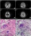 Brain MRI. Diffusion images showing hyperintense areas consistent with multiple areas of cerebral ischemia (orange arrows). A. occipital lobe. B and C. temporal lobe. periventricular level. and D. parietal cortex. E and F: Skin biopsy electron microscopy: Vascular proliferation with segmental hyalinization of the wall. PAS-positive X40.