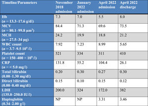 On the last admission in April 2022, we received an order of two RBCUs for the same reason at the transfusion service and donor blood center. On admission, the patient was normothermic, normotensive and had normal heart and respiratory rates. Laboratory results at each admission from 2018 to 2022 are summarized in Table 1. He was polymedicated, but had not taken any documented medications correlated with auto-anti-RBC production.11