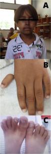 The clinical and laboratory profiles of FA (Table 3) showed that most patients had hematological alterations (80%), particularly medullary failure (87.5%). Hypoplasia of the BM was seen in 92.86% and aplasia in 7.14%. Café au lait spots occurred in 62.5% of the cases and 53% of the patients had skeletal changes, especially thumb hypoplasia (40%) (Figure 1). Fewer patients had short stature, protruding ears, microcephaly, heart disease and unilateral renal agenesis.
