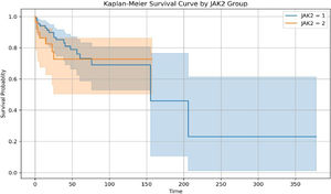 MethodologyWe retrospectively analyzed 123 patients with primary myelofibrosis who underwent genetic testing. We created 2 groups according to JAK2 levels. Group comparability was assessed by comparing baseline demographics and follow-up time between groups. Normality and heteroscedasticity of continuous data were assessed using the Shapiro-Wilk and Levene tests, respectively. Continuous outcomes were compared using unpaired Student t-test, Welch t-test or Mann-Whitney U test, depending on the data distribution. Discrete outcomes were compared using Chi-Squared or Fisher's exact test, respectively. The alpha risk was set at 5% and two-tailed tests were used.
