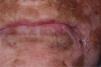 An extra oral examination revealed diffuse hypochromic and hyperchromic skin lesions (Figure 1), and palpable submandibular and cervical lymph nodes. The oral examination revealed a very poor hygiene status, scleroderma with a severe limitation of mouth opening, severe mucosal atrophy and ulcerations, absence of tongue papillae, a pseudomembrane on the anterior third part of the left buccal mucosa, and an indurated retrocomissural ulcerated nodule of approximately 1cm in diameter (Figure 2). The panoramic radiographic image showed residual root fragments and loose teeth (Figure 3).