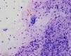 Upon arrival, she had tachycardia at 112 beats per minute, WBC 20,680/L, Hemoglobin 9.0 g/dL, ALT 56 units/L, Lactate Dehydrogenase 358 units/L. Imaging revealed no acute infectious findings. Despite starting broadspectrum antibiotics and steroids, her dyspnea progressed and she required oxygen support. Repeat labs revealed WBC 21,570/L with eosinophils of 1730/L. Bronchoscopy was conducted and bronchoalveolar lavage revealed Strongyloides (Figure 1).