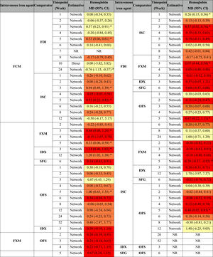 Change in hemoglobin levelsAcross timepoints, FCM versus FDI showed small and variable mean differences, with no consistent clinically important differences. Early contrasts favored FCM over some alternatives at isolated timepoints (e.g., weeks 3-5), while FDI versus ISC showed modest early gains (week 1-3).