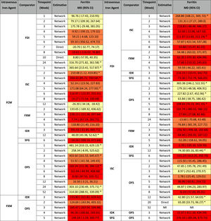 IDX: Iron dextran; SFG: Sodium ferric gluconate complex; ISC: Iron sucrose; FXM: ferumoxytol; FCM: Ferric carboxymaltose; FDI: Ferric derisomaltose; OFS: Oral Ferrous Sulfate; NR: Not reported; 95 % CI: 95 % Confidence interval.