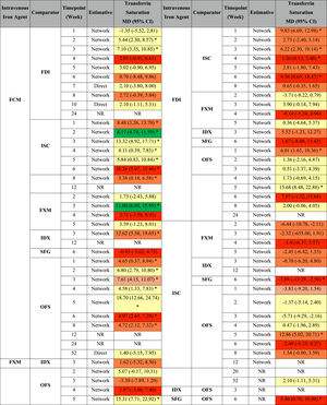 Change in Ferritin levelsAt 4-8 weeks, FCM consistently increased ferritin versus OFS and most IV comparators; FDI and ISC also outperformed OFS at several timepoints. Some head-to-head contrasts (e.g., FCM versus FDI and ISC) favored FCM early, but differences narrowed by 10-24 weeks. Timepoint-specific mean differences and certainty are shown in Table 2 (overall) and Supplement Tables 14 and 15.